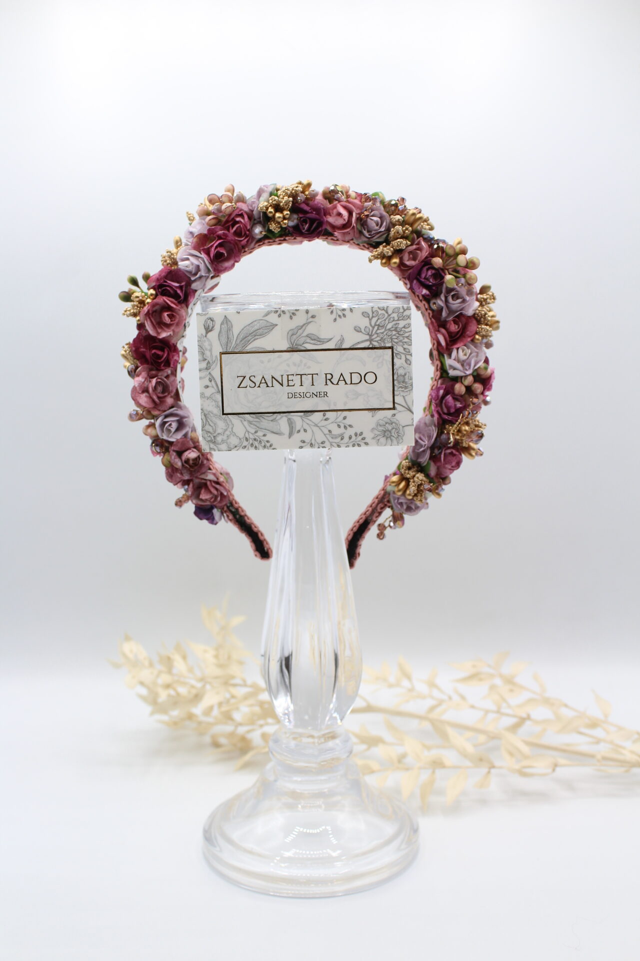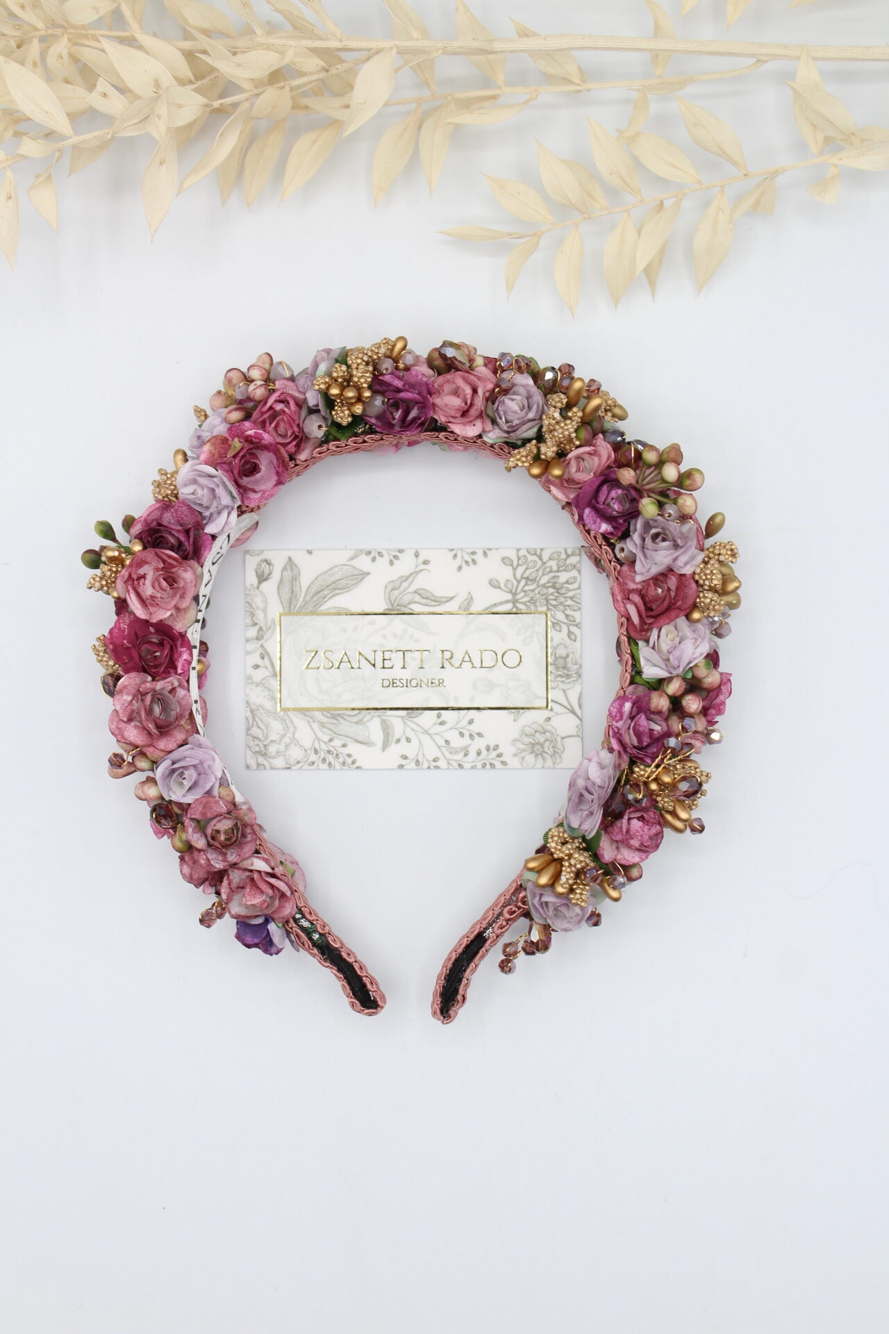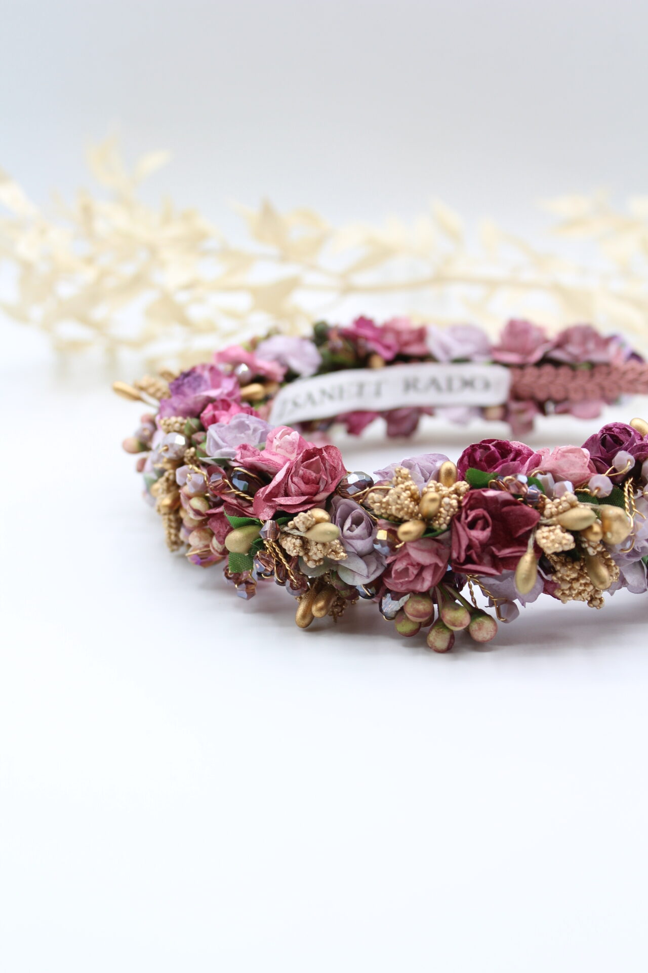 Jede einzelne Rosenblüte wurde von mir mit viel Liebe zum Detail handbemalt, kombiniert habe ich “Rosalinda” mit facettierten Lilafärbigen Glasperlen und Kunst-Knospen. Die Innenseite ist mit einer Borte fixiert, damit es beim tragen möglichst bequem ist.