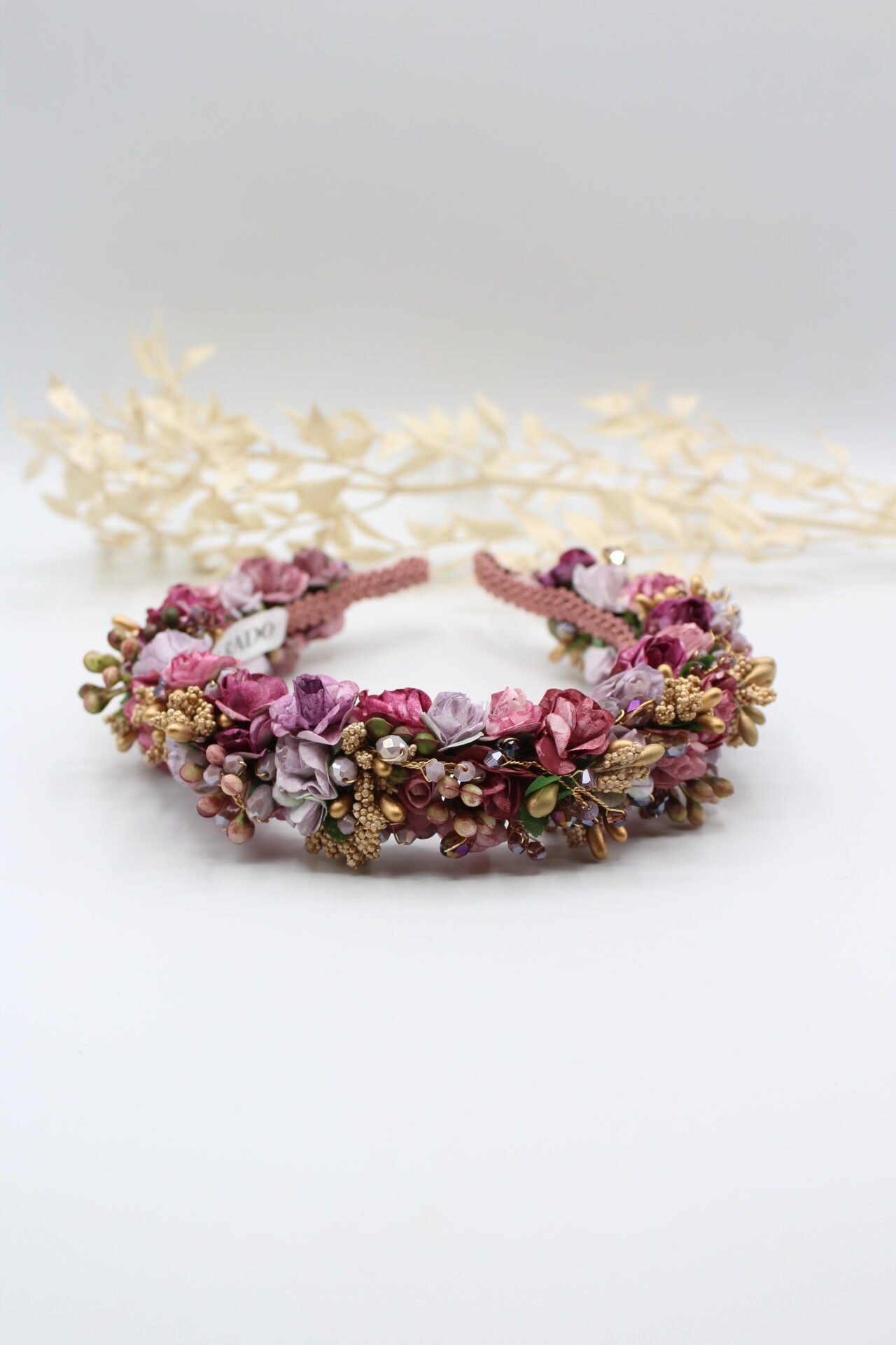 Auf den Seiden-Haarreif sind die Blüten dreireihig gebunden, somit ist “Rosalinda” etwas auffälliger und üppiger im Design.