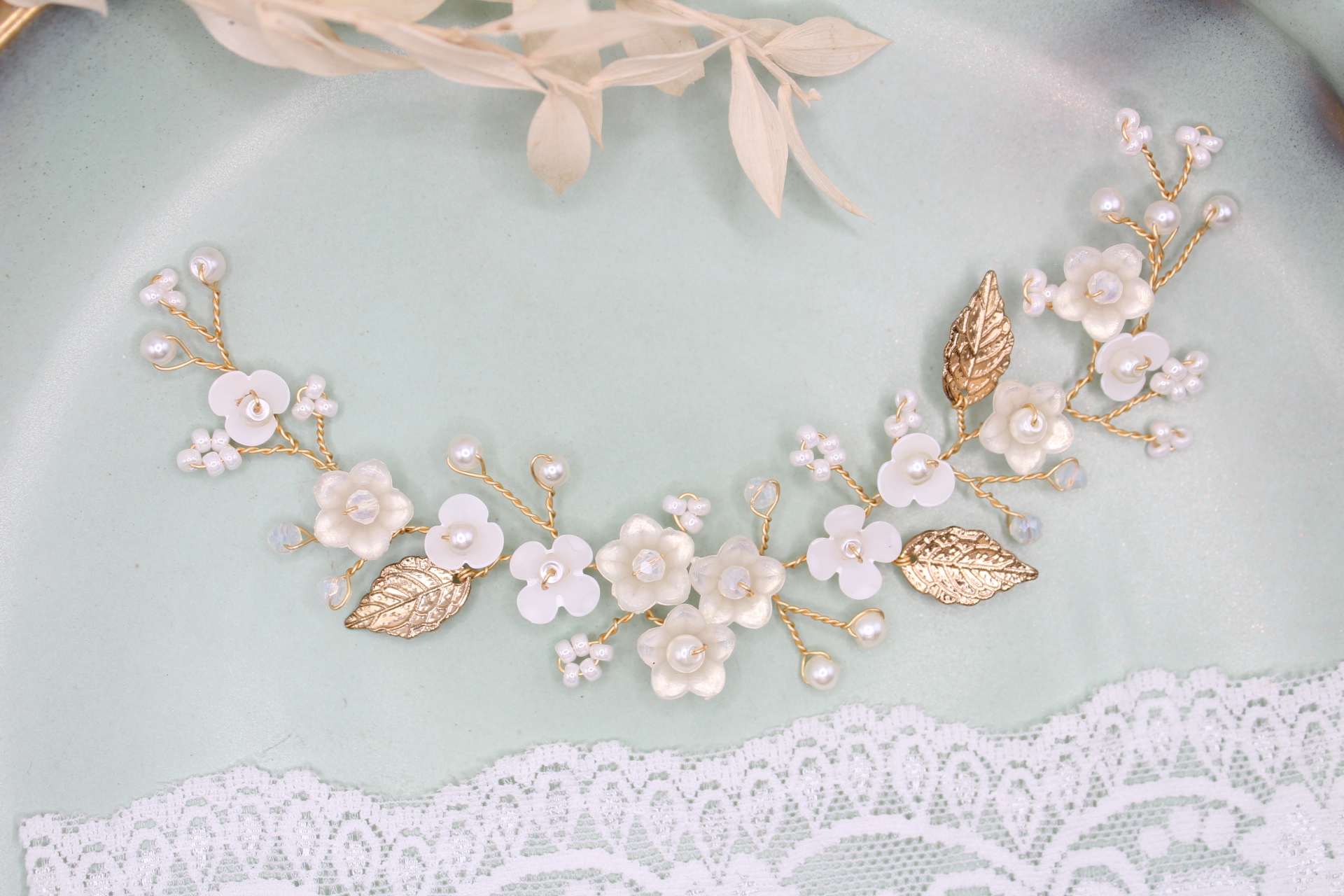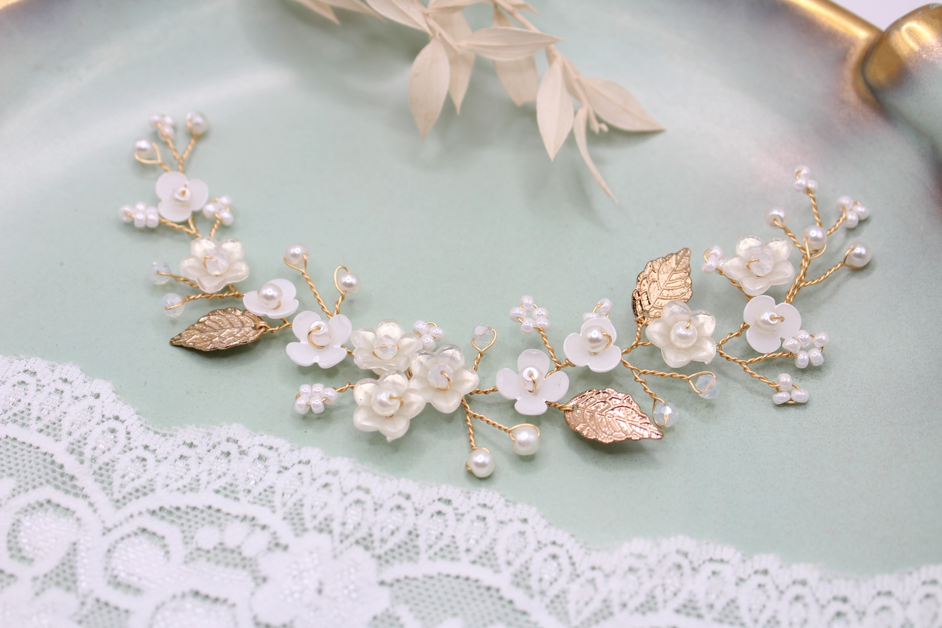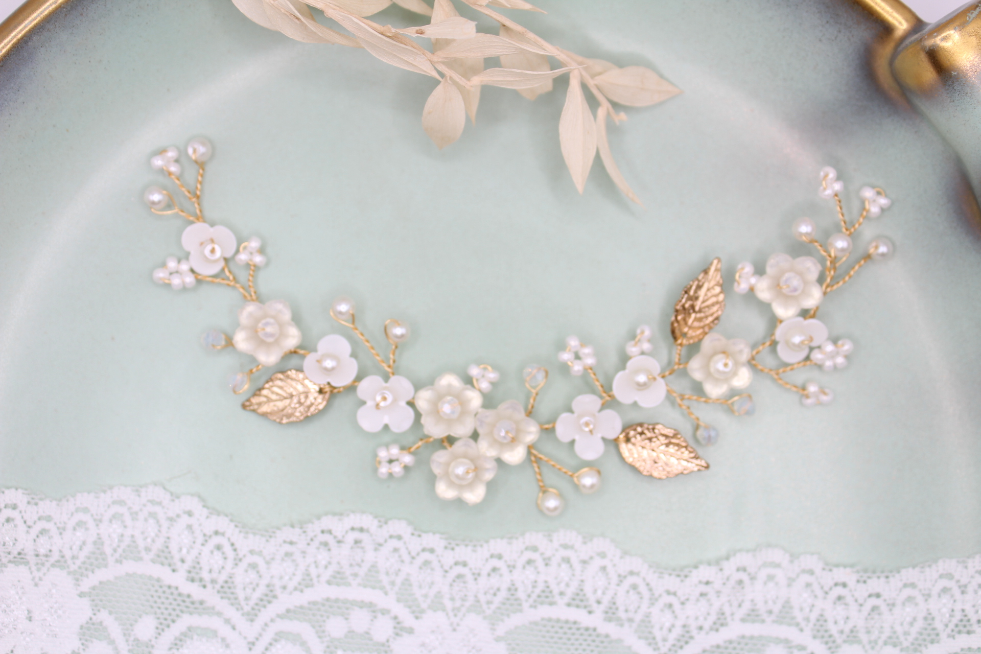 “Annalena” besteht aus von mir in liebevoller Handarbeit bemalten zarten Blumen, die ich mit Glaswachs Perlen, facettierten Glasperlen und Miyuki Perlen kombiniert habe. Das besondere an “Annalena” ist die Vielfalt an Tragemöglichkeiten, ob mit oder ohne Schleier, “Annalena” ist das Highlight in jeder Frisur.