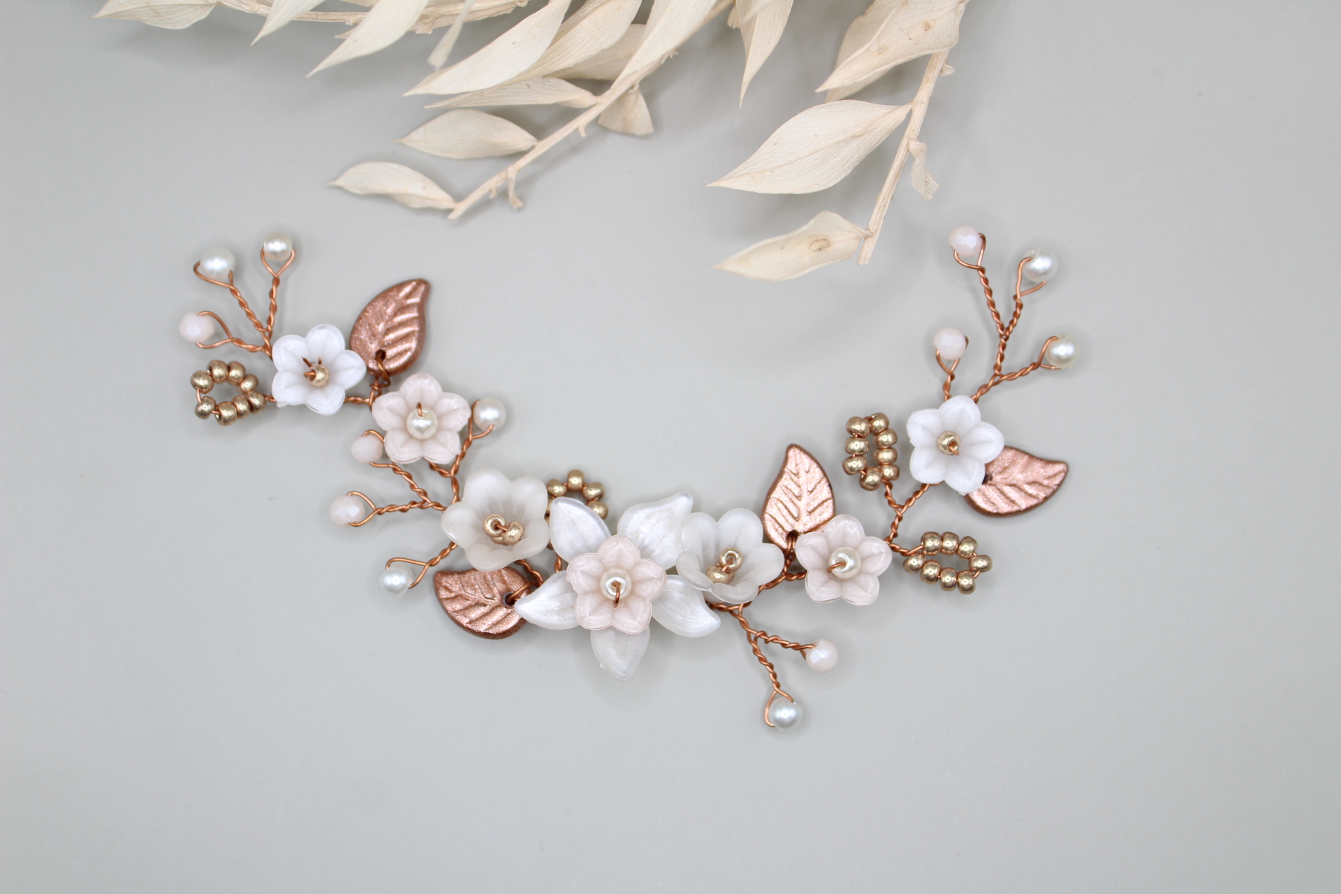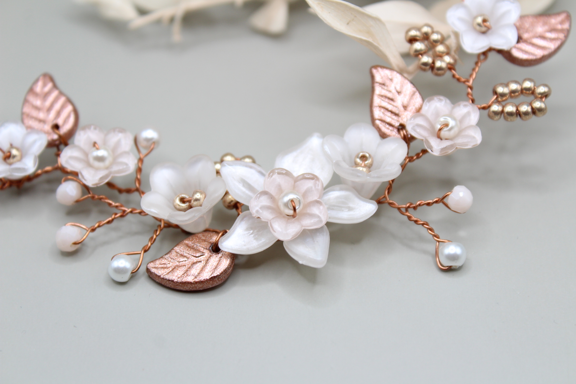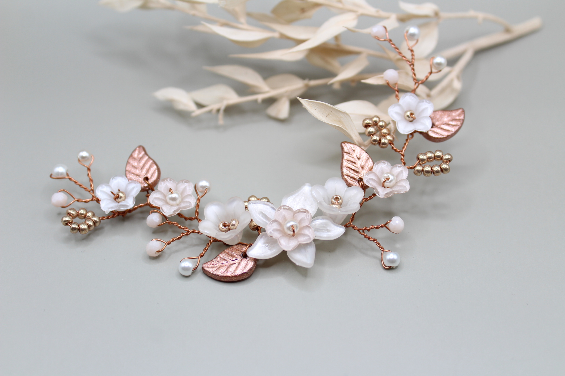 Haarteil “Ivett” besteht aus von mir mit viel Liebe handbemalten Blumen und Blätter, die ich mit Miyuki Perlen und facettierten Glasperlen kombiniert habe . Das besondere an “Ivett” ist die Vielfalt an Tragemöglichkeiten, ob mit oder ohne Schleier, die biegsamen Teile sind das Highlight in jeder Frisur. Befestigt wird “Ivett” einfach mit Bobby Pins.