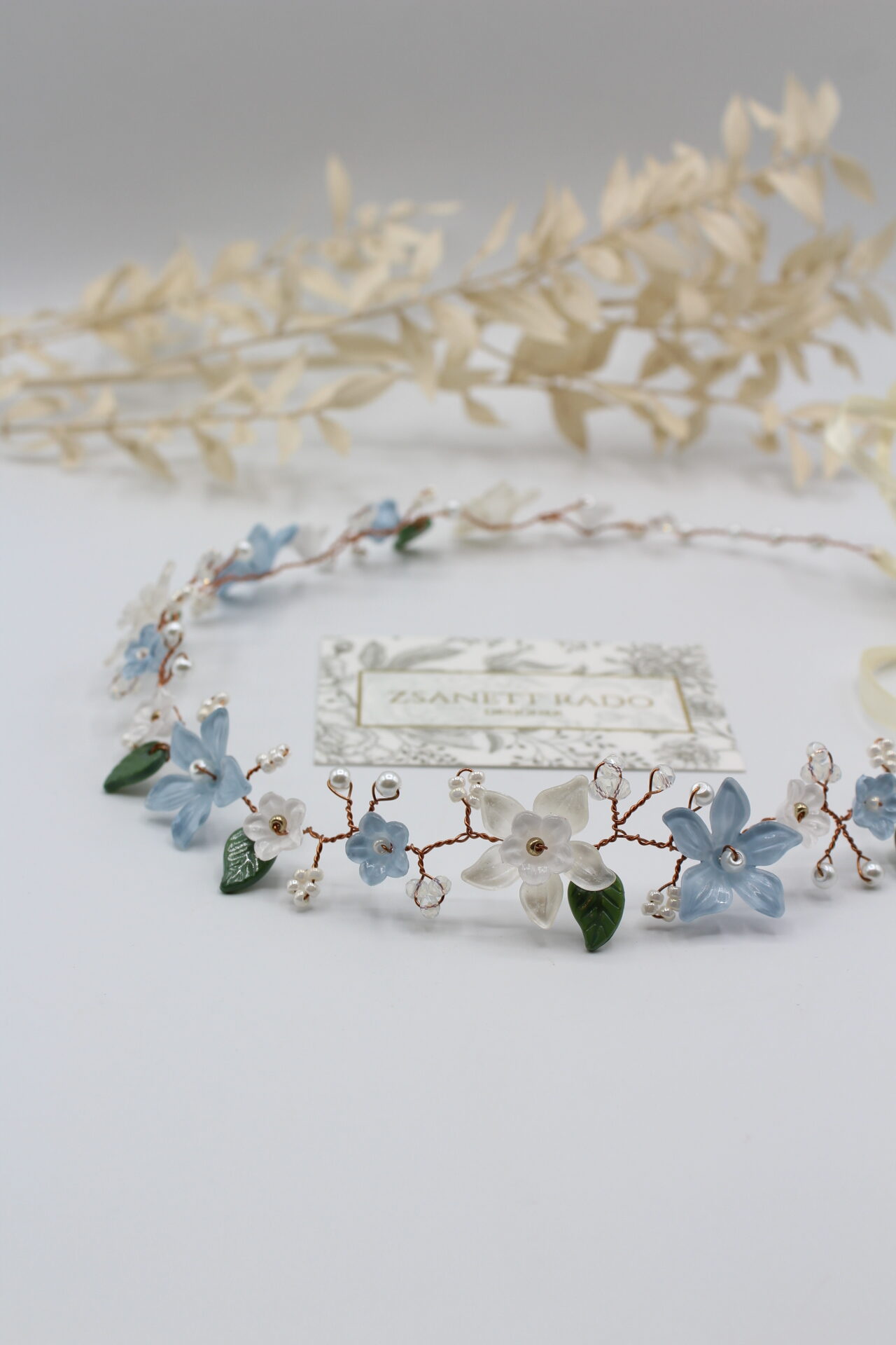Haarreif “Elly” besteht aus facettierten Glasperlen in Zartblau. Die Blüten wurden von mir mit viel Liebe zum Detail handbemalt. Alle Elemente sind von mir per Hand darauf genäht worden.