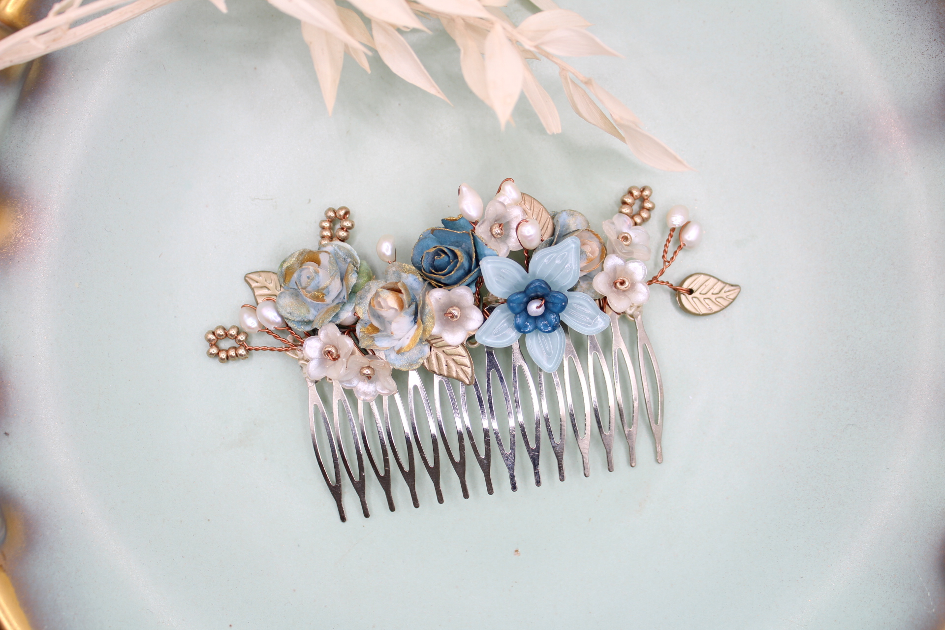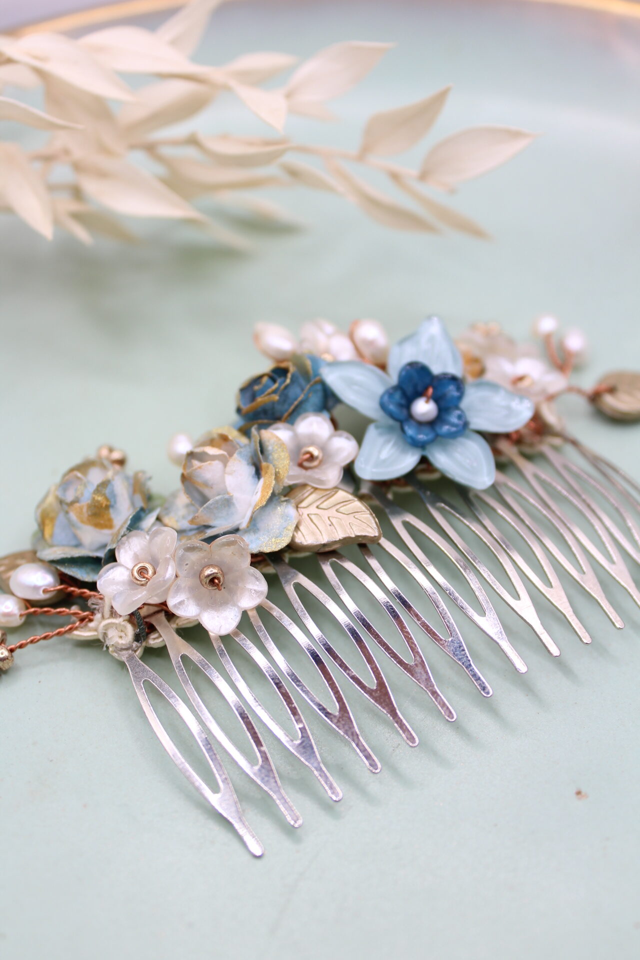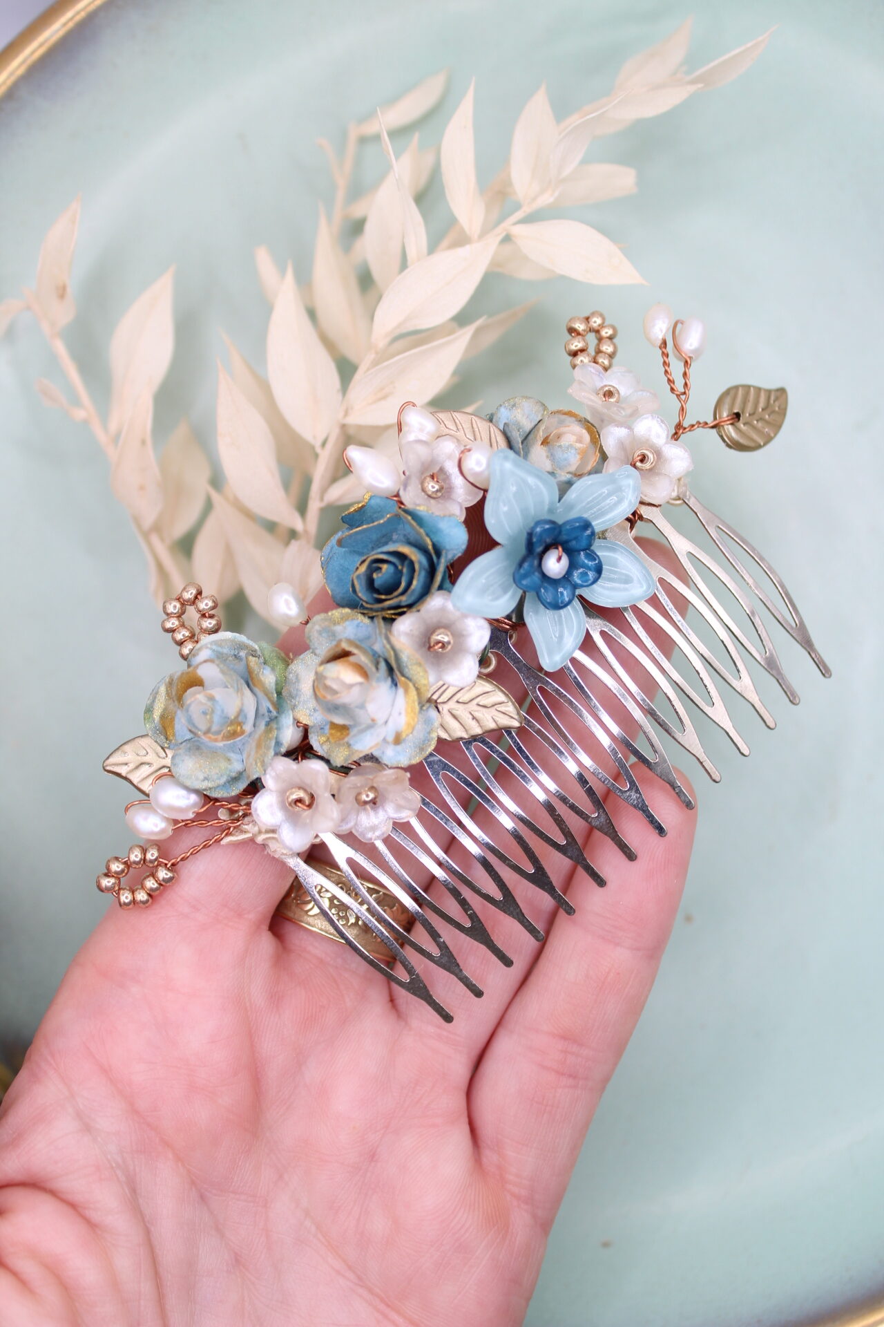 Haarkamm “Rita” besteht aus von mir in liebevoller Handarbeit bemalten Blumen und Blätter, die ich mit Miyuki Perlen und Süsswasser Perlen kombiniert habe. “Rita” kann man vielfältig in jede Frisur nach Belieben mit oder ohne Schleier einarbeiten. Ist ein traumhafter Teil für eine perfekte Trachtenfrisur.