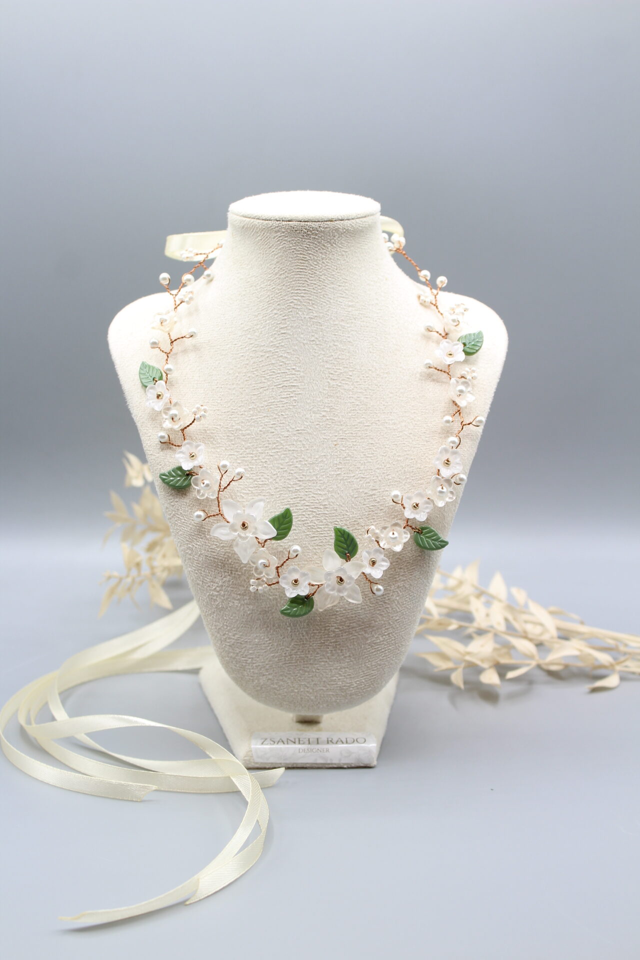 Haarkranz “Jasmin” besteht aus von mir in liebevoller Handarbeit bemalten Blumen und Blätter, die ich mit Glaswachsperlen und facettierten Glasperlen kombiniert habe. Das besondere daran ist das man auch als Collier tragen kann. Durch den flexiblen Design kann man sehr leicht in jeder Frisur einarbeiten.
