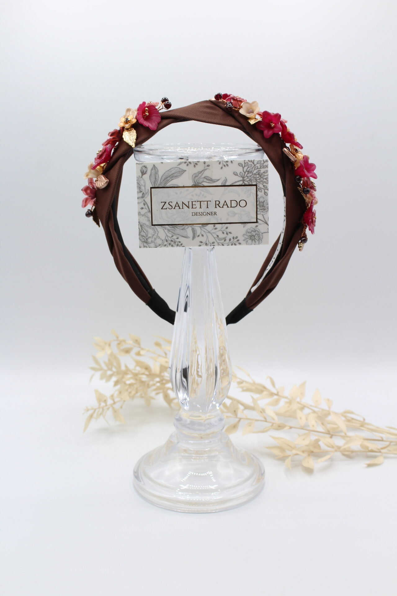 Die Blumen und die Rose färbigen Blätter wurden von mir handbemalt und sorgfältig auf den feinen Stoff-Haarreif genäht. Die Blüten sind seitlich angeordnet, ergänzt hab ich mit Edelsteinen, Miyuki Perlen und facettierten Glasperlen. Dank des federleichten Design liegt der Reif sanft auf dem Kopf und drückt nicht, sodass er den ganzen Tag über bequem und angenehm zu tragen ist.