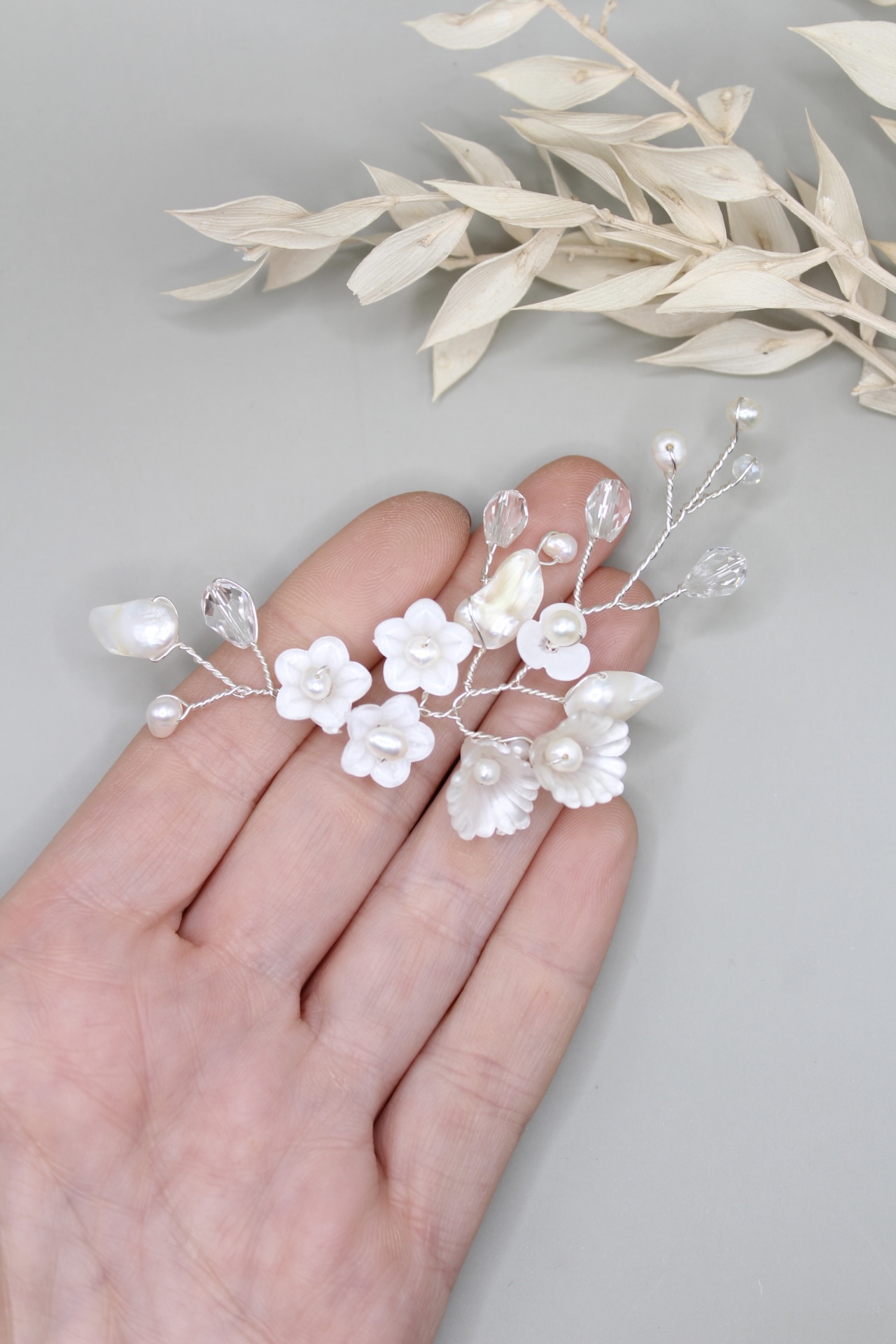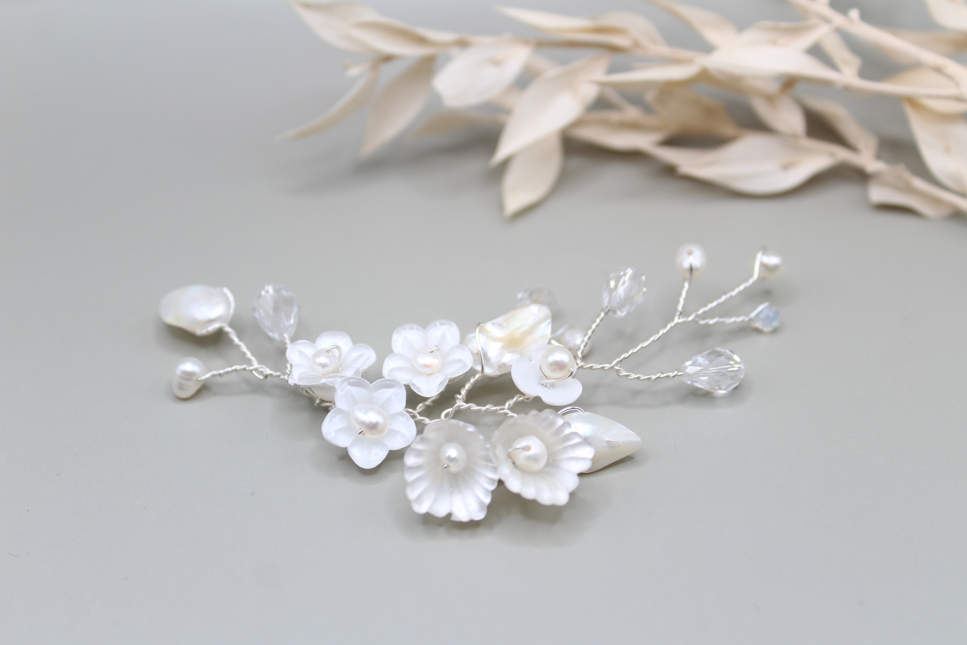 “Annie” besteht aus von mir in liebevoller Handarbeit bemalten zarten Blumen, echte Süsswasser Perlen und aus facettierten Glasperlen in Tropfen Form. Das besondere an “Annie” ist die Vielfalt an Tragemöglichkeiten, ob mit oder ohne Schleier, “Annie” ist das Highlight in jeder Frisur.