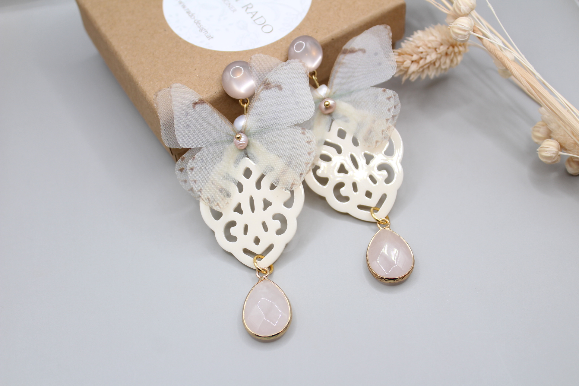 Die Ohrring Serie “Mariposa”steht für Leichtigkeit, Romantik, und besondere Details. Jedes Paar wird aus hochwertigen Kunstharz-Elementen, handbemalten Blumen, edlen Süsswasser Perlen sowie zarten Stoff Schmetterlingen von mir per Hand gefertigt.