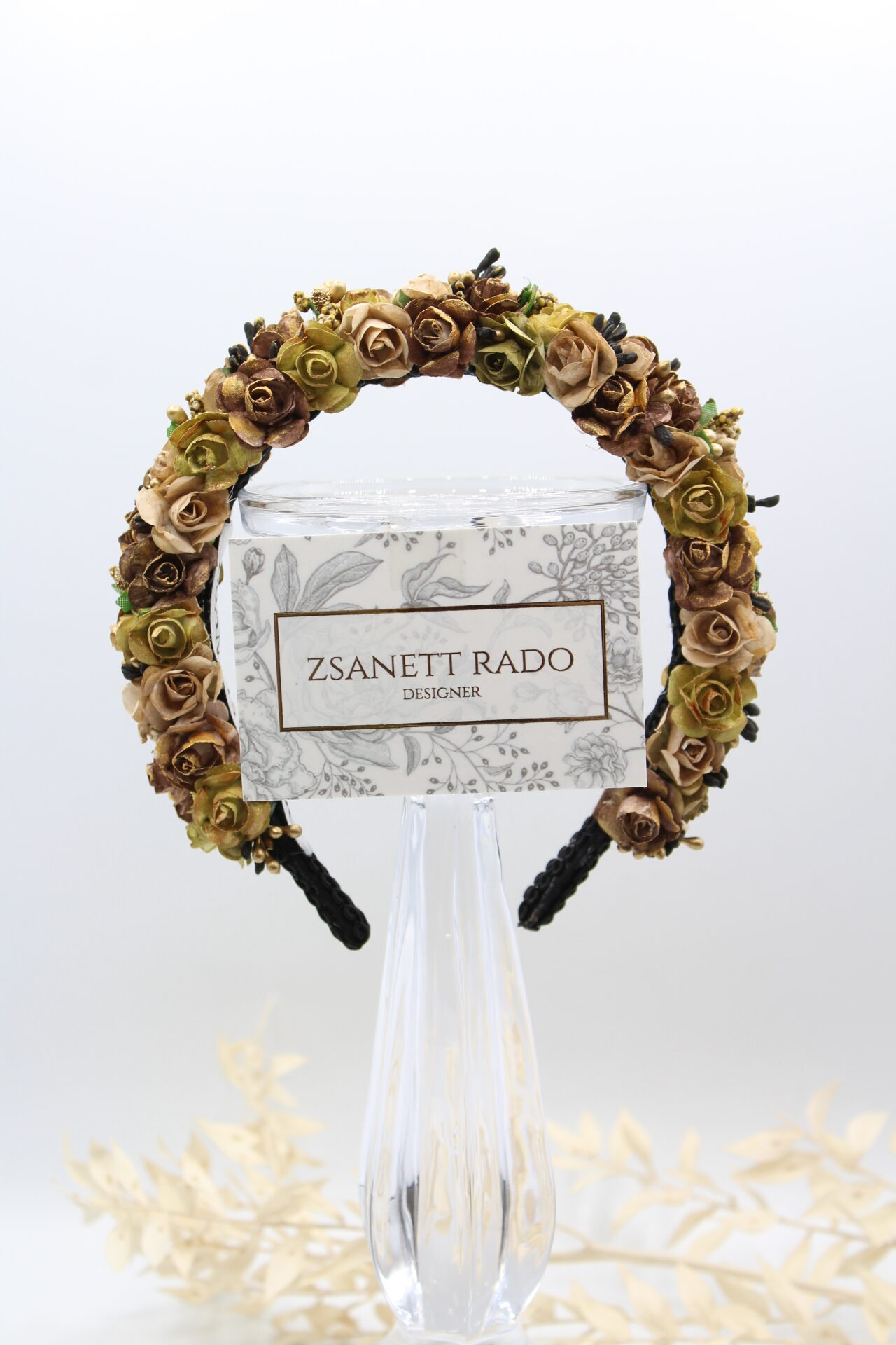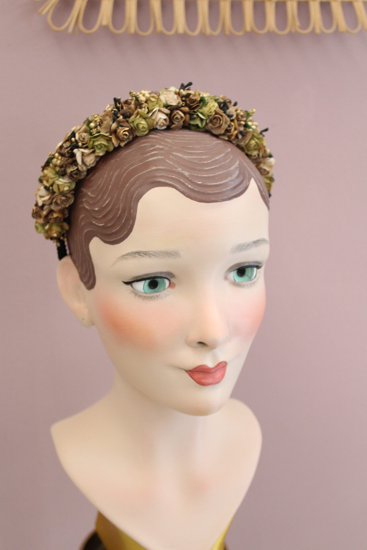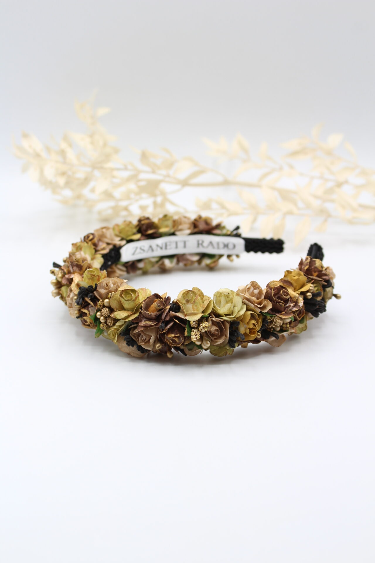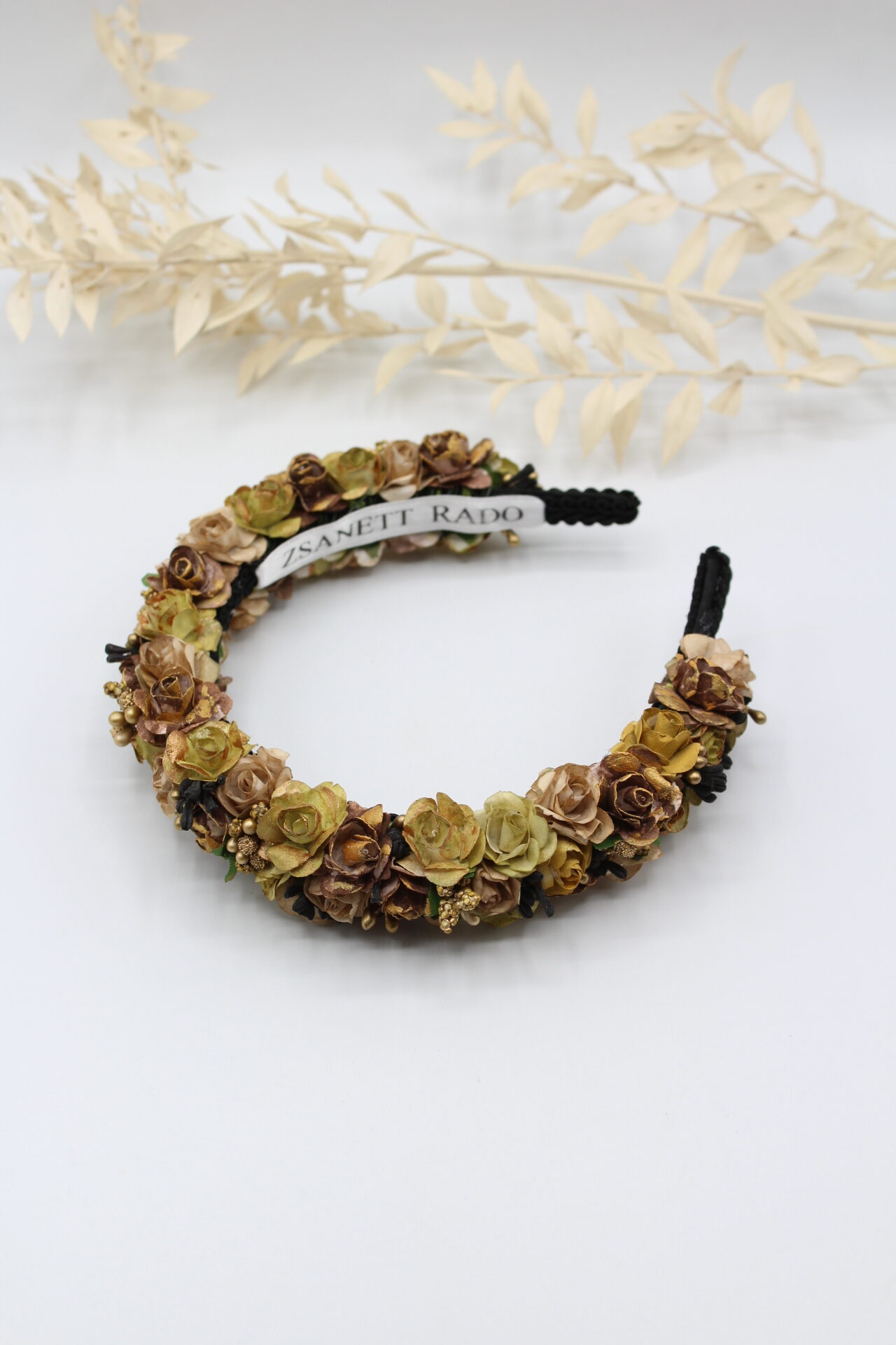 Die feinen Rosenblüten wurden von mir mit viel Liebe zum Detail handbemalt. Die Innenseite hab ich mit einer Borte fixiert, damit es beim Tragen möglichst bequem ist. Die Blüten sind dreireihig auf einem Haarreif von mir gebunden, somit ist “Aloisa” etwas auffälliger und üppiger im Design.