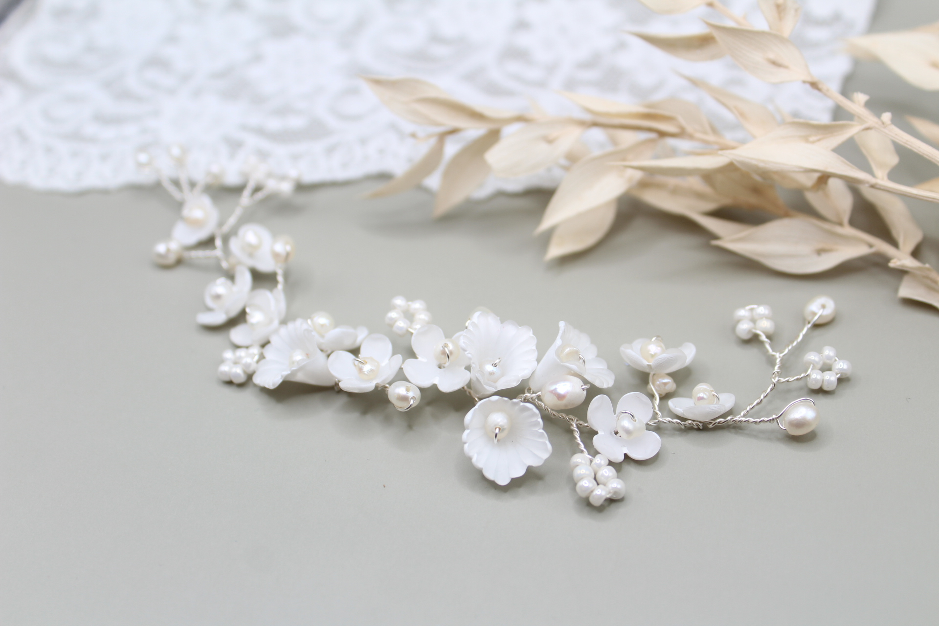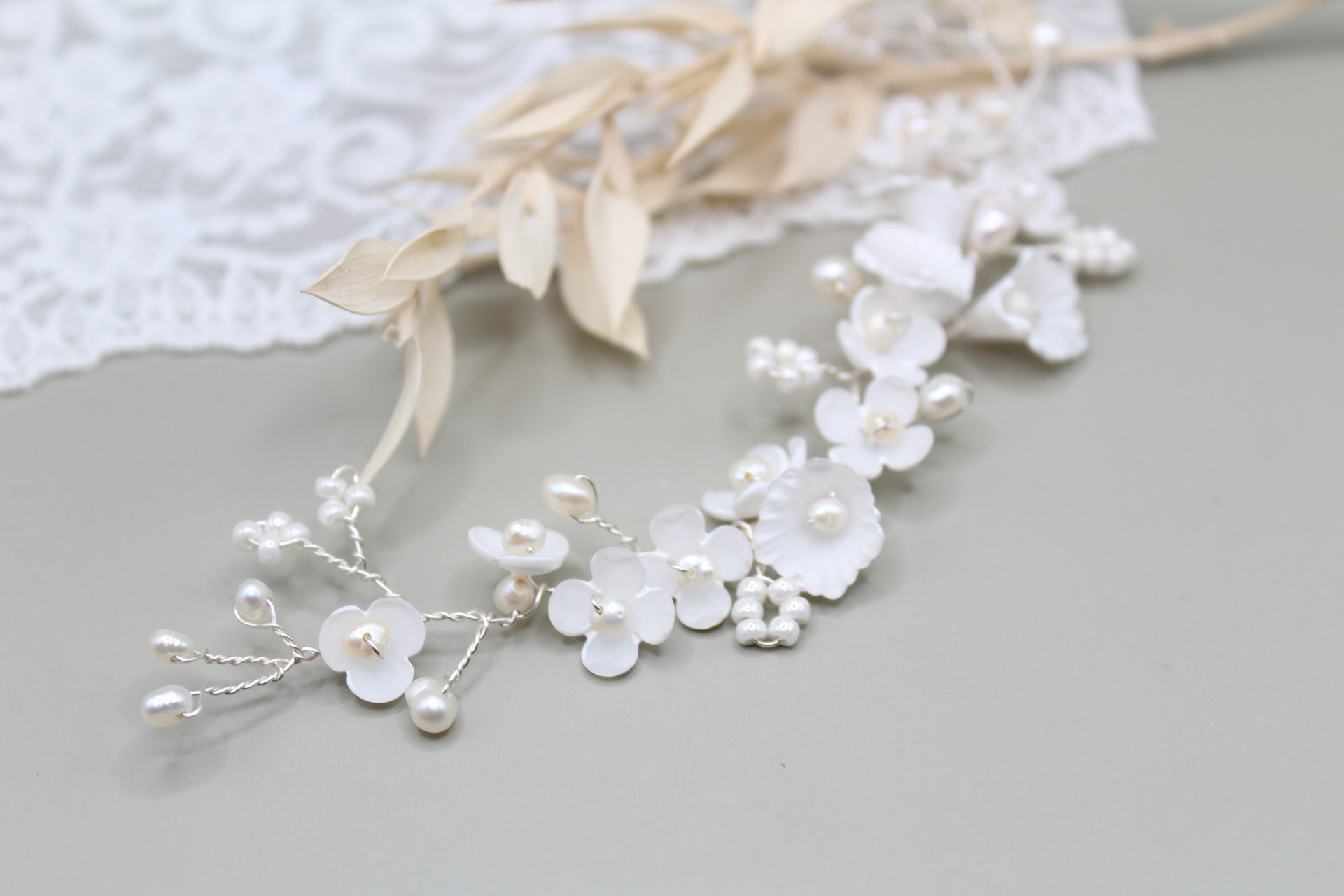 Haarteil “Abigel” besteht aus von mir mit viel liebe handbemalten zarten Blumen, die ich mit Süsswasser Perlen und japanische Miyuki Perlen kombiniert habe. “Abigel” ist zart, romantisch und edel zugleich.