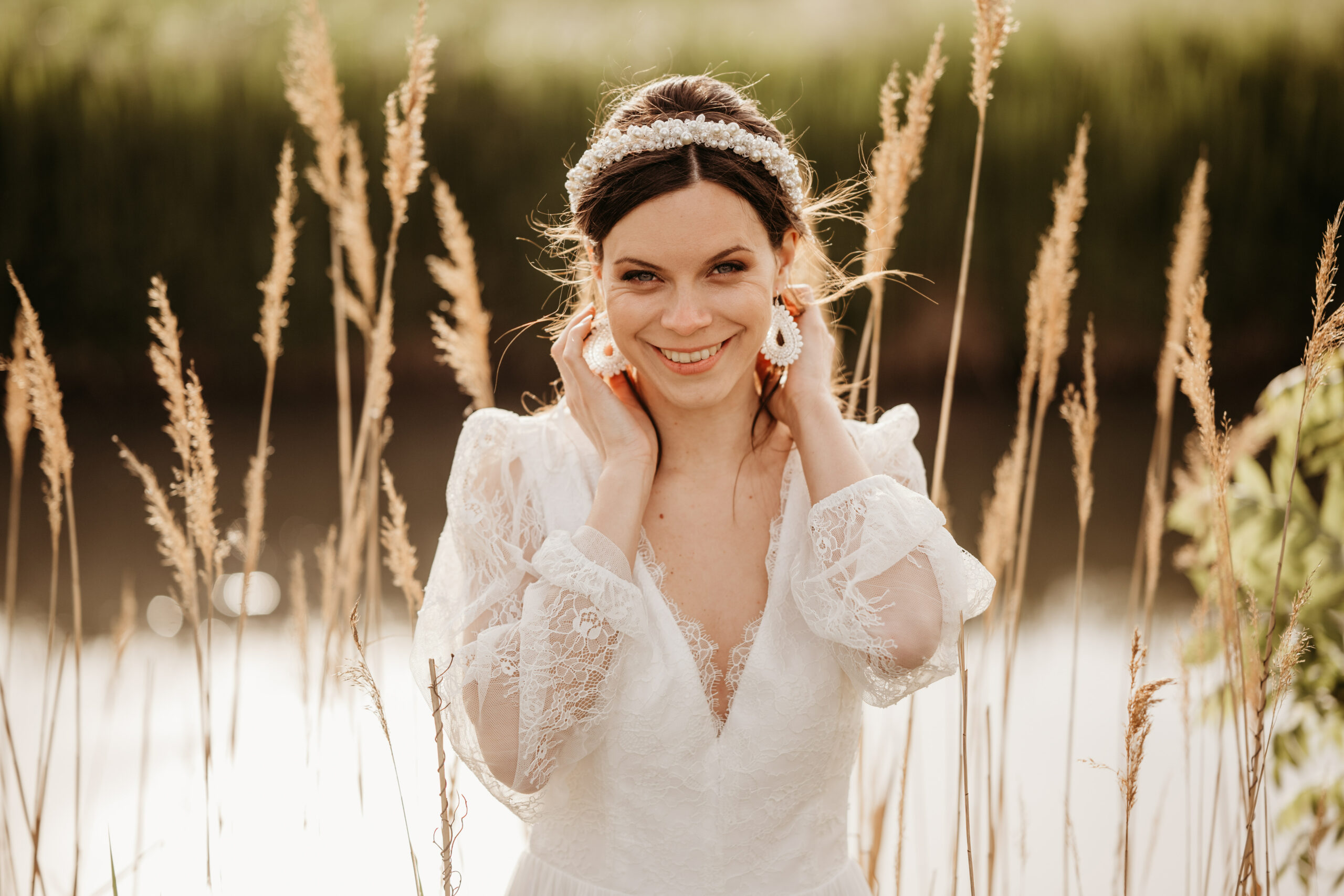 Die Haarreif “Abril” besteht aus Glaswachsperlen und aus facettierten Glasperlen. Die Perlen wurden von mir mehrreihig Hand gebunden. “Abril” passt perfekt zu einem romantischen Hochzeitslook, siehe Bild.