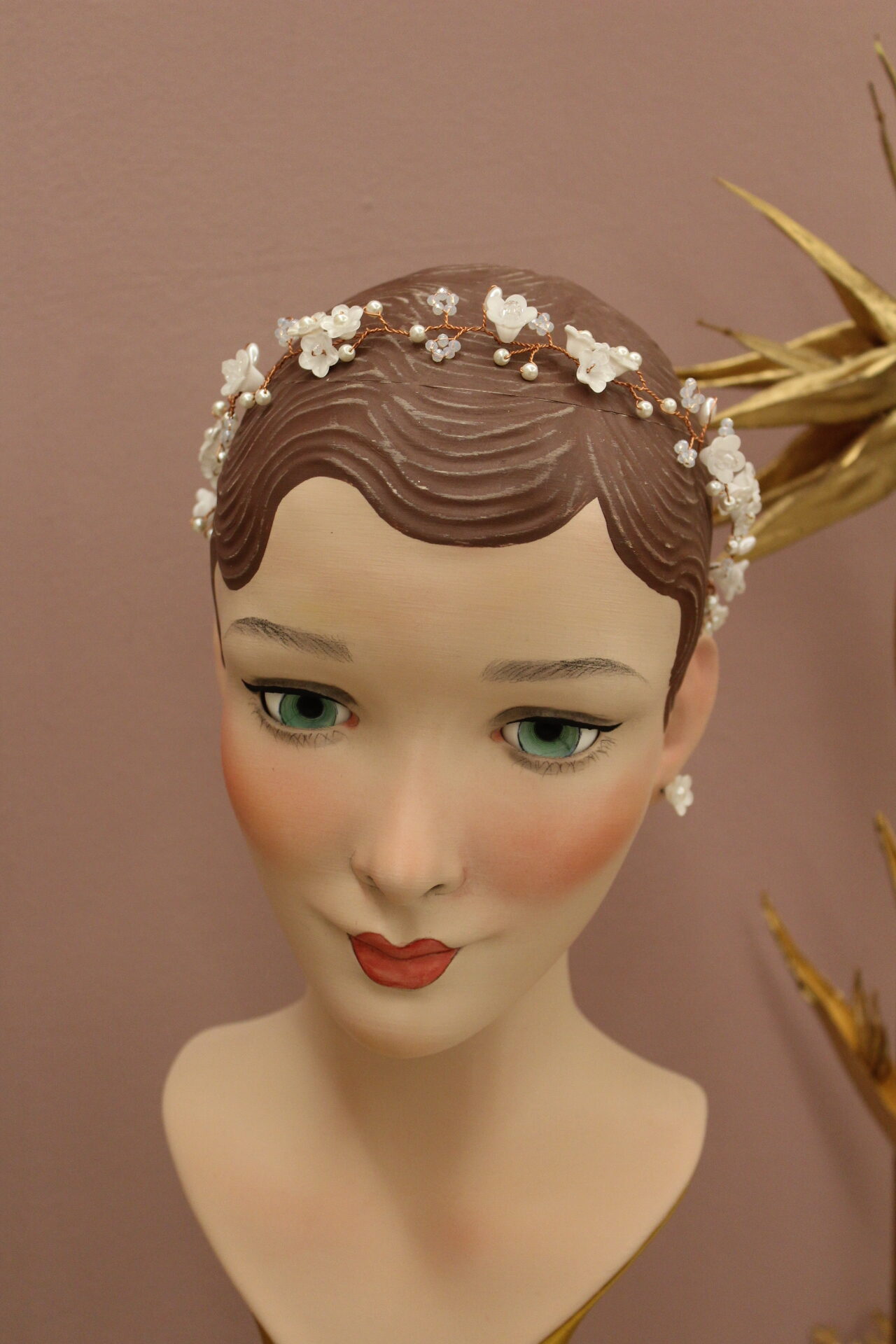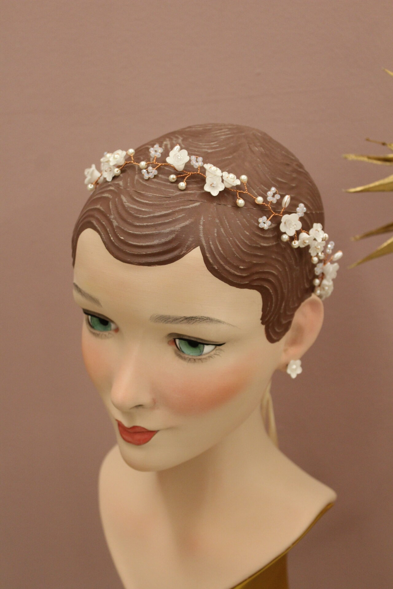 Haarkranz “Adel” besteht aus von mir in liebevoller Handarbeit bemalten Blumen, die ich mit Glaswachsperlen und facettierten Glasperlen kombiniert habe. Das besondere daran ist das man auch als Collier tragen kann. Durch den flexiblen Design kann man sehr leicht in jeder Frisur einarbeiten.
