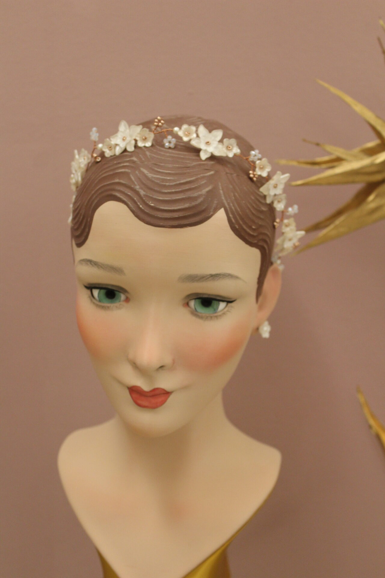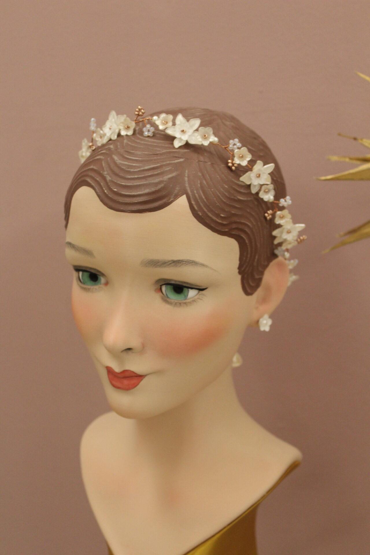 Haarkranz “Leonora” besteht aus von mir in liebevoller Handarbeit bemalten Blumen, die ich mit facettierten Glasperlen und Miyuki Perlen kombiniert habe. Das besondere daran ist das man auch als Collier tragen kann. Durch den flexiblen Design kann man sehr leicht in jeder Frisur einarbeiten.